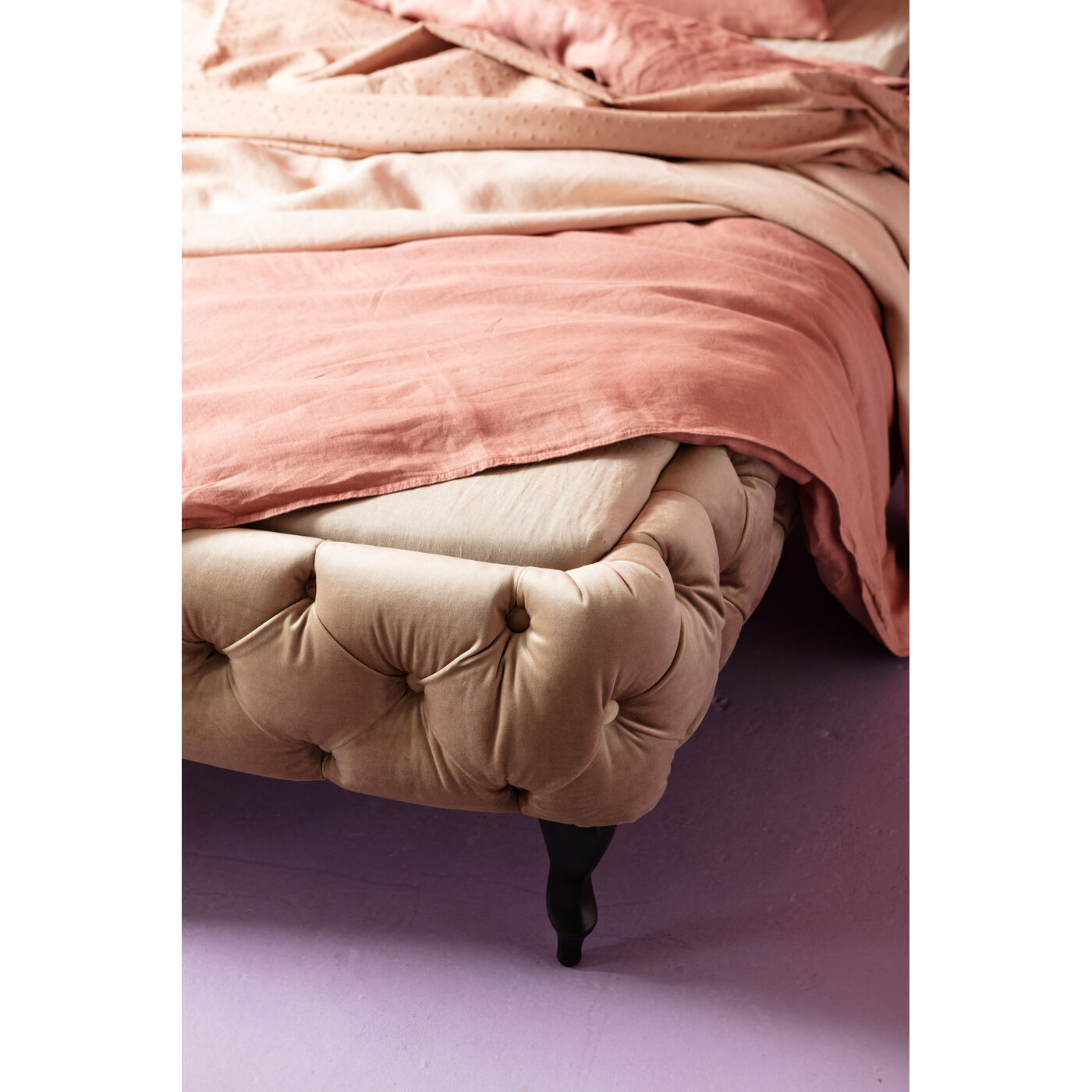 This bed from the Desire upholstered collection is based on the look of the legendary Chesterfield furniture. The upholstered bed is buttoned all around and on the high backrest. Together with the large reclining surface this makes for a sensationally cosy place to sleep. The velvet look of the cover is especially refined: it shimmers lighter and darker depending on how the light falls. The light natural shade of ecru is also fashionable and can be combined well with different furnishing styles.Shipping Options Explanation