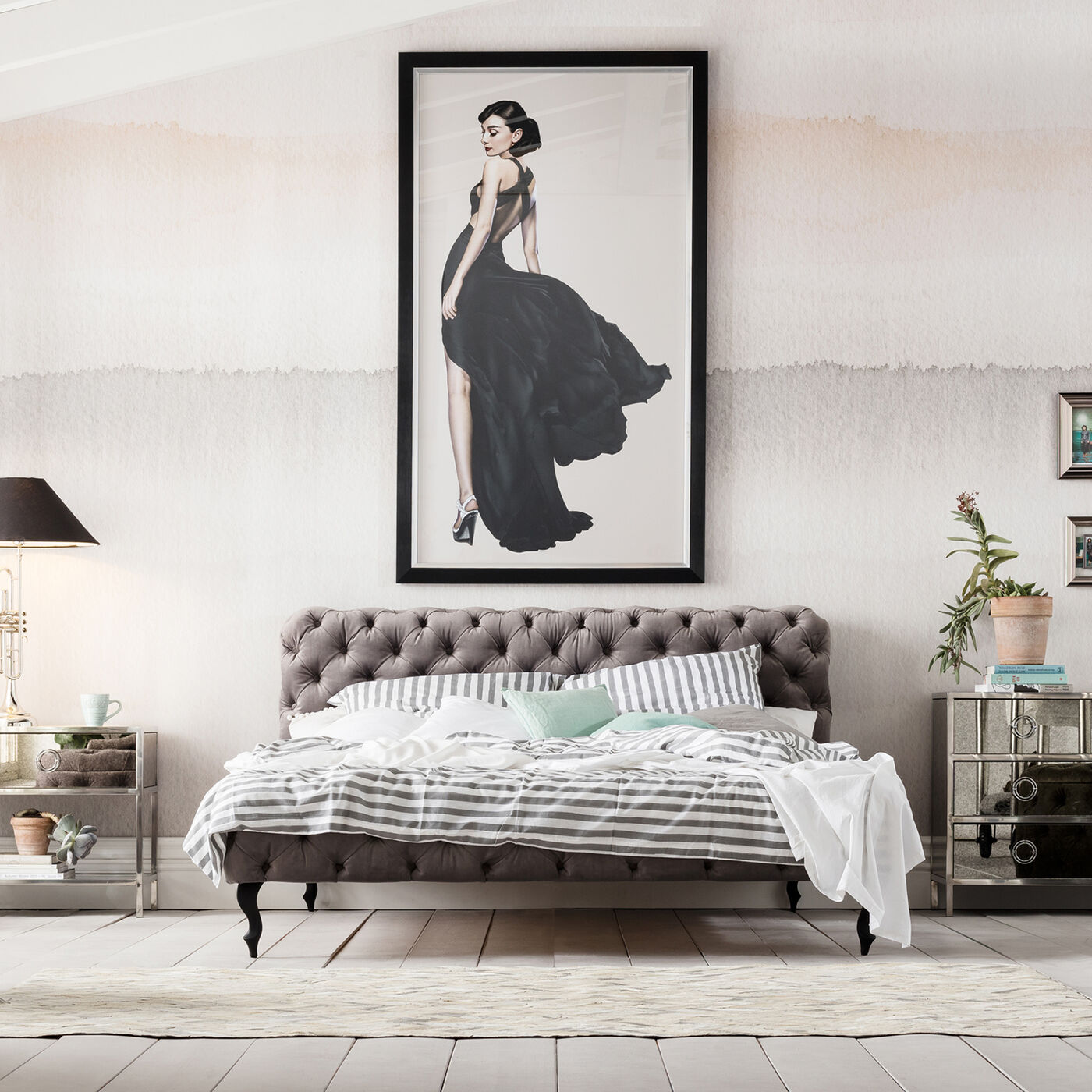- This silver-grey upholstered bed with a velvety cover, also in silver-grey, elaborate button stitching and neo-baroque feet in solid beech is really luxurious