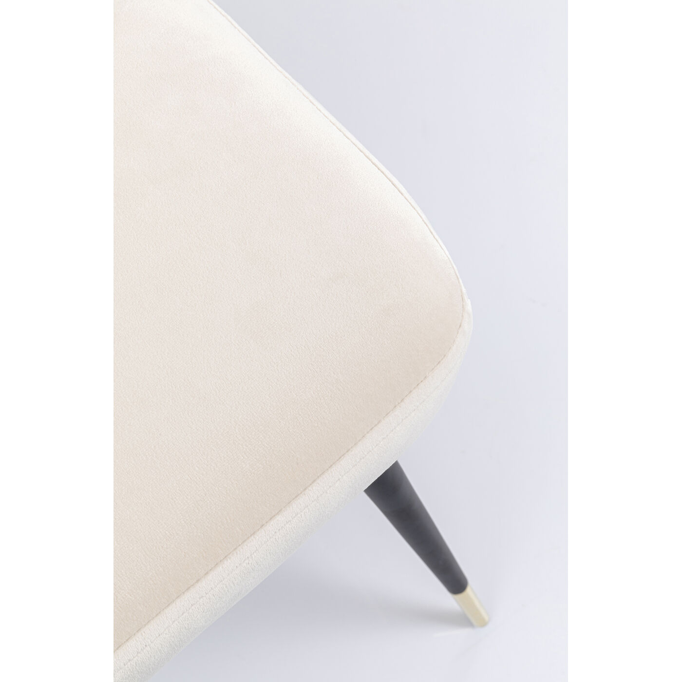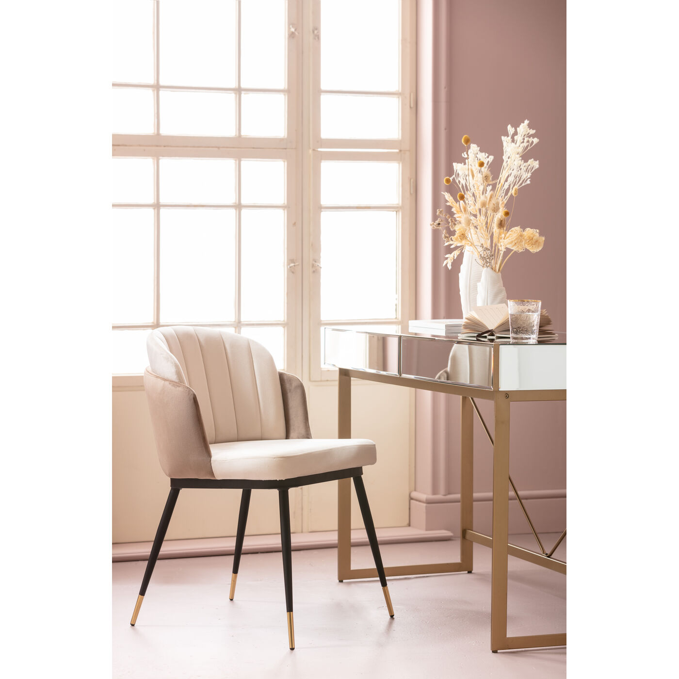 You can sit comfortably on this stylish velvet chair, even if the dinner party or meeting lasts a little longer. The shell shape and quilting make this designer chair a sensational centrepiece in the living room, dining room or study. The delicate natural tones of the cover in combination with the elegant, slightly flared legs in black and gold lacquered steel have a subtly glamorous.Shipping Options Explanation