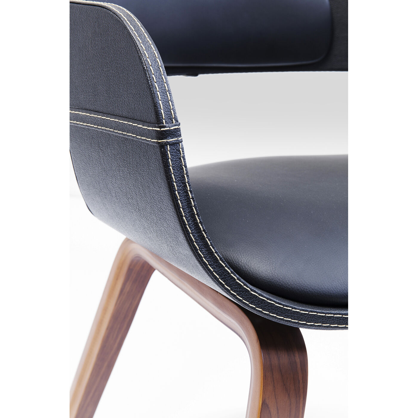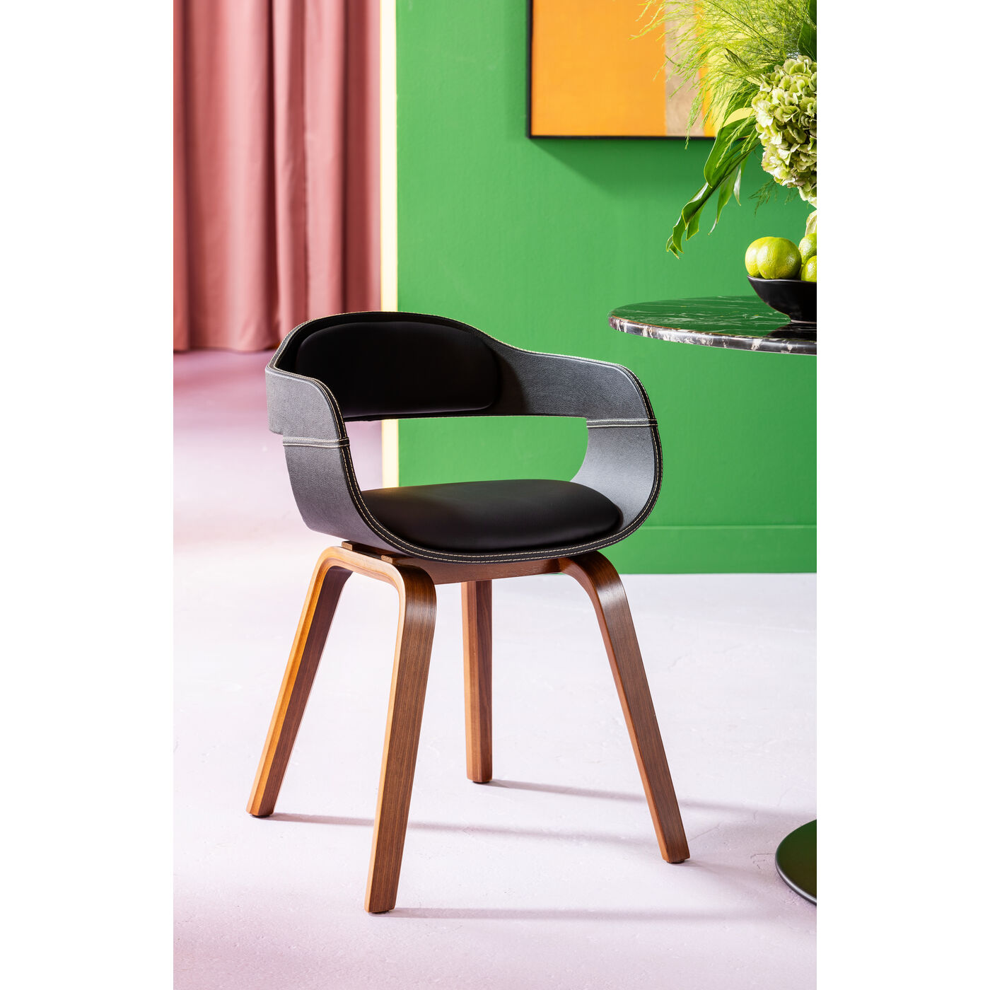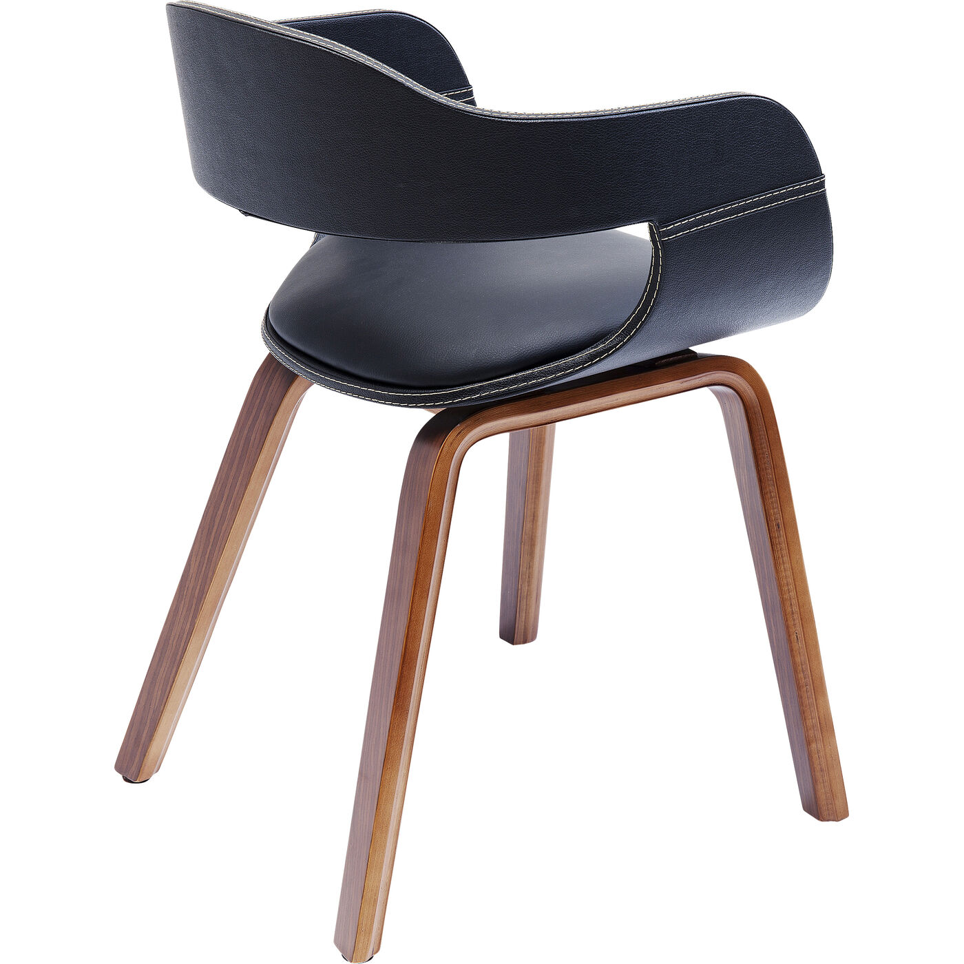 Chair: aristocratic elegance in black and walnut. In the Costa Walnut chair, black and a strong brown form a charming contrast. The comfortable black seat with its black armrests and backrest are supported by four legs made of walnut. Curvy contours characterise the elegant design of this chair, in which the formal idiom has a discreet tone. So much elegance with soothing understatement is well suited to conference rooms with a classically beautiful ambience, but also to living rooms which radiate a cultivated comfort.Shipping Options Explanation