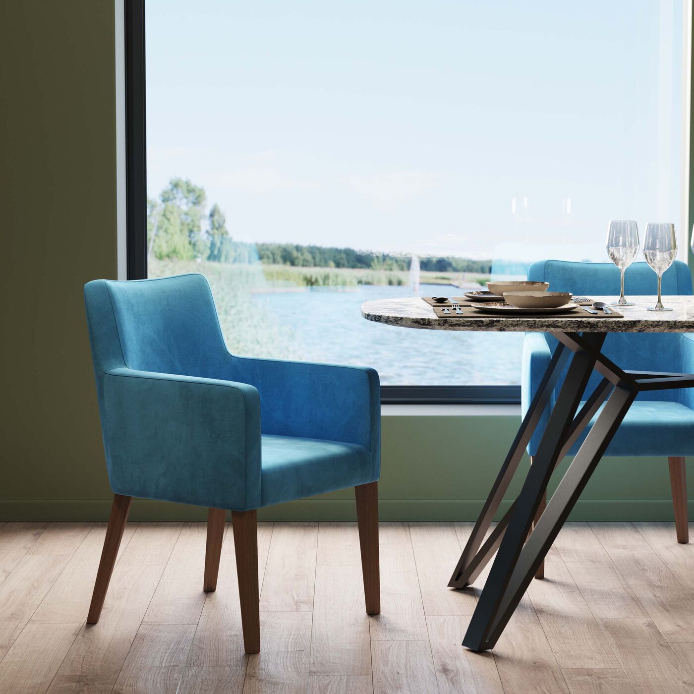 An elegant upholstered chair with a velvet-soft cover made of polyester velvet. Gives every dining room a touch of exclusivity. The dark wooden legs also contribute to this. Made in the EU. Other versions available.Shipping Options Explanation