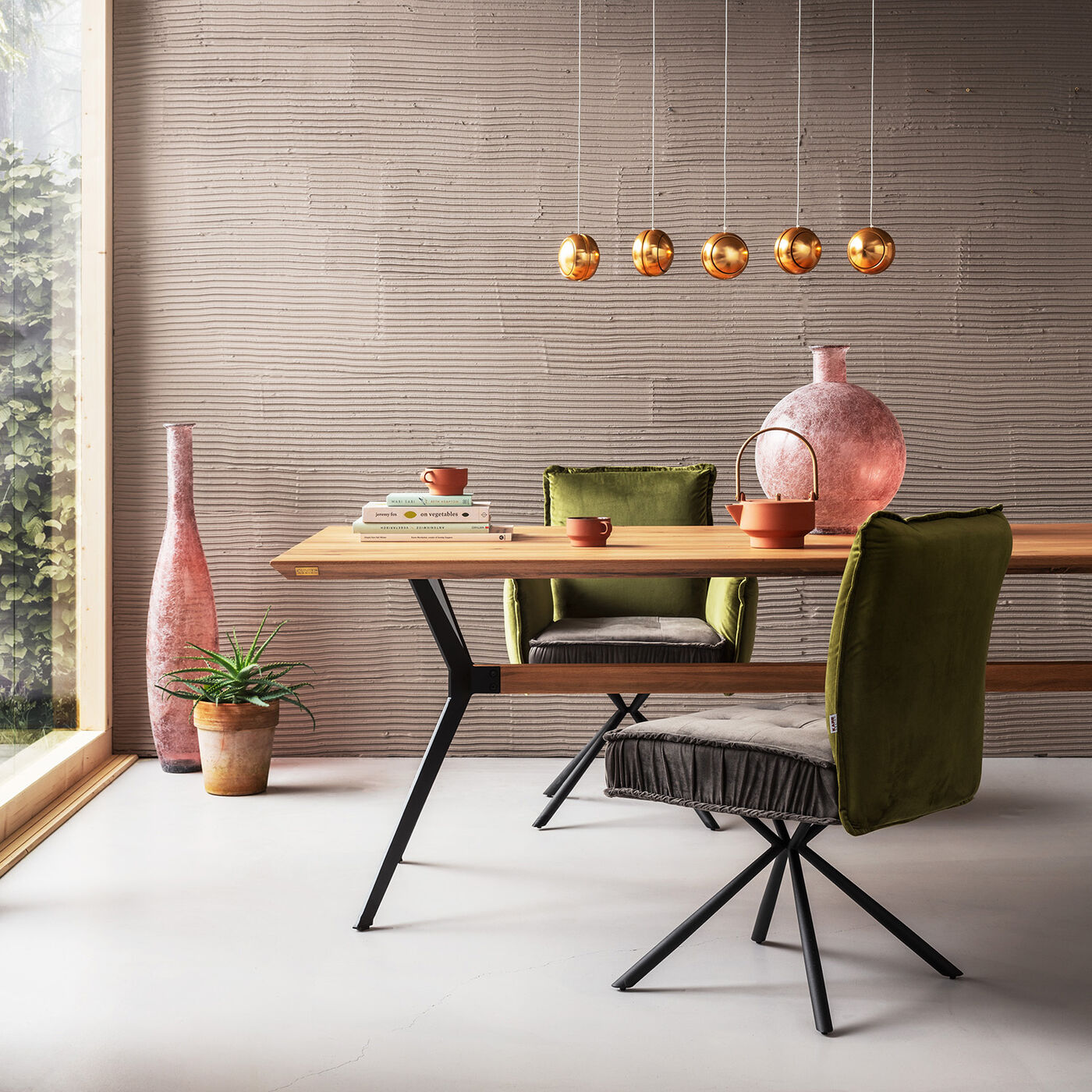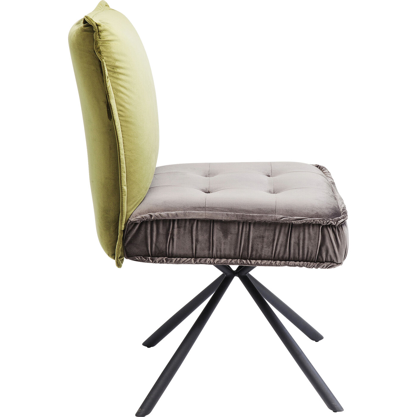 A designer chair that catches everyone s eye. This is due to its design idea: the seat is modelled on a floor cushion with button stitching, the back cushion is made in the shape of a sofa cushion with piped seams. Together, they make a comfortable dining chair whose swivel function makes it easy to sit down and get up. The chair without armrests is also very easy to slide under any table. This original chair is not only suitable for the dining room. As an upholstered chair, it is also a good choice for long sessions at the desk or meeting table. Seat height 49cm and loadable up to 120 kg.Shipping Options Explanation